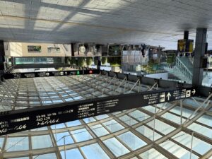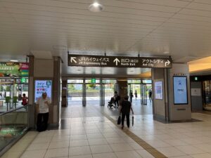 JR浜松駅北口を出ると、正面にバスロータリーへ続く通路が見えてきます。通路へ続く階段・エレベーターを正面に、左斜め方向(進行方向正面の遠鉄百貨店が目印)へお進みください。