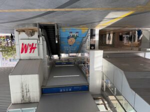 遠鉄百貨店連絡通路下をそのまま直進すると、高架橋下すぐそばに、遠州鉄道新浜松駅入口(青色の看板または「H&M」様看板が目印)がございます。